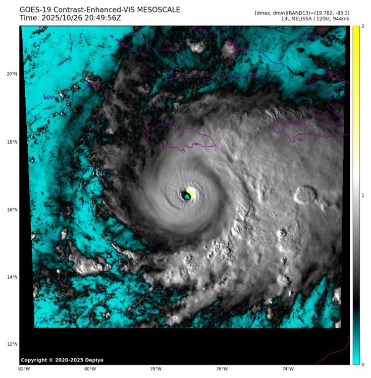 Melissa se déplace lentement vers l'ouest à environ 7 km/h (5 mi/h). Une lente progression vers l'ouest est prévue aujourd'hui, suivie d'un virage vers le nord et le nord-est lundi et mardi. Selon les prévisions, le centre de Melissa devrait se rapprocher de la Jamaïque pendant le week-end et survoler l'île mardi. Les images satellite indiquent que les vents maximums soutenus ont rapidement augmenté pour atteindre près de 220 km/h (140 mi/h), avec des rafales plus fortes. Une intensification rapide est attendue jusqu'à ce soir, suivie de fluctuations d'intensité. Melissa devrait devenir un ouragan majeur lorsqu'il touchera terre en Jamaïque lundi soir ou mardi matin. Les vents de force ouragan s'étendent jusqu'à 35 km (25 miles) du centre et les vents de force tempête tropicale s'étendent jusqu'à 280 km (175 miles). L'ouragan Melissa devrait produire des précipitations atteignant 350 à 700 mm (15 à 30 pouces) sur certaines parties de la Jamaïque au cours des prochains jours, avec des quantités plus importantes sur les terrains vallonnés. Des crues soudaines et des glissements de terrain catastrophiques sont probables.