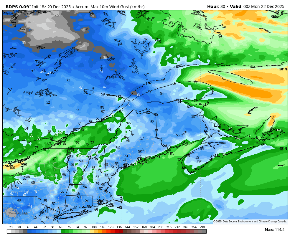 12°C à Pointe-au-Père, 11°C à Mont-Joli et 13°C à Cap-Chat. Une station privé sur Wunderground rapporte 15°C à Sainte-Anne-des-Monts, pas impossible avec le vent descendant des montagnes. C'est quelque chose qui arrive une ou deux fois par hiver ici entre le 1er décembre et le 1 avril. J'ai déjà vu 17°C en janvier en 1996 ou 1997 avec un vent sud-est de 130 km/h. La porte-patio voulait bombait comme si elle allait explosé. Jamais rien vue de tel depuis. Les rafales de vents sont très bof pour le moment. Vague impression que le vent du Sud-ouest serait beaucoup plus puissant. -