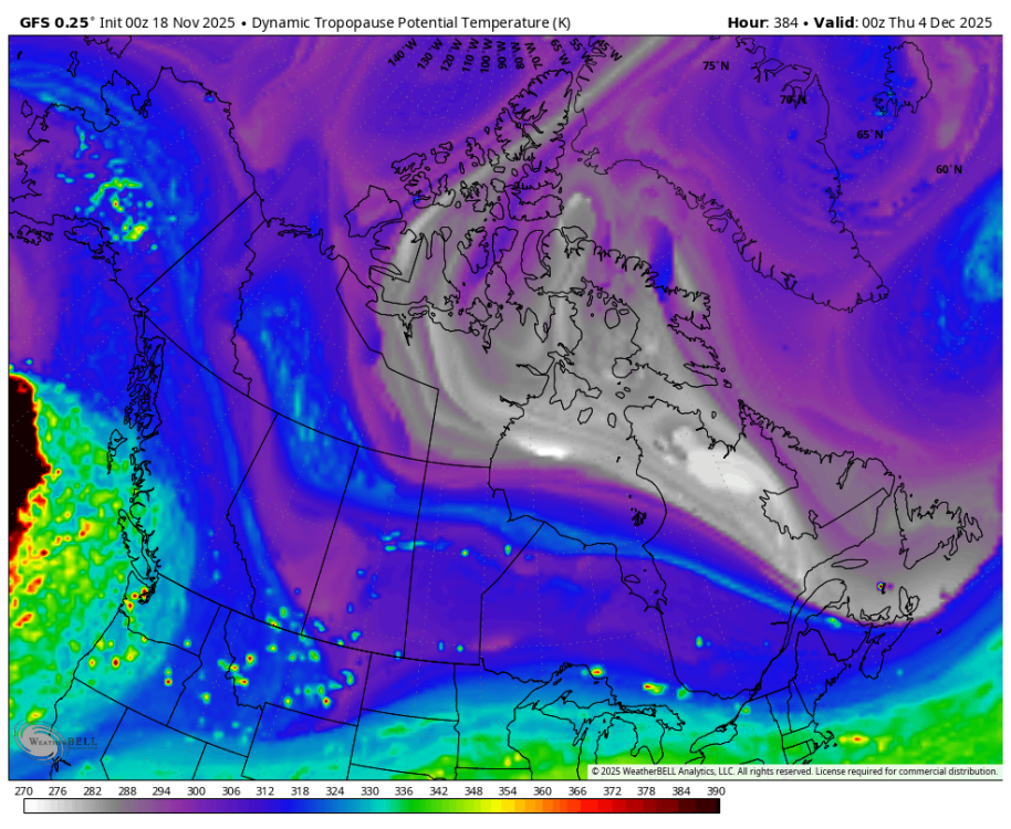 On voit très bien le fort blocage au Nord de notre tête dont je fais référence assez souvent et de-là aussi, les températures très douce pour ce coin de l'Arctique. On voit le froid encapsuler @ l'ouest qui va prendre de la force de jours en jours et venir @ nous juste @ temps pour l'ouverture de notre hiver météo. Mais cela on en discutera dans la bonne section. -