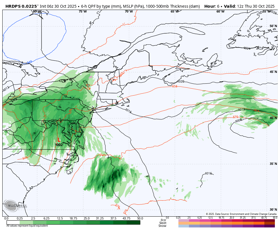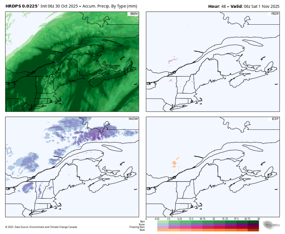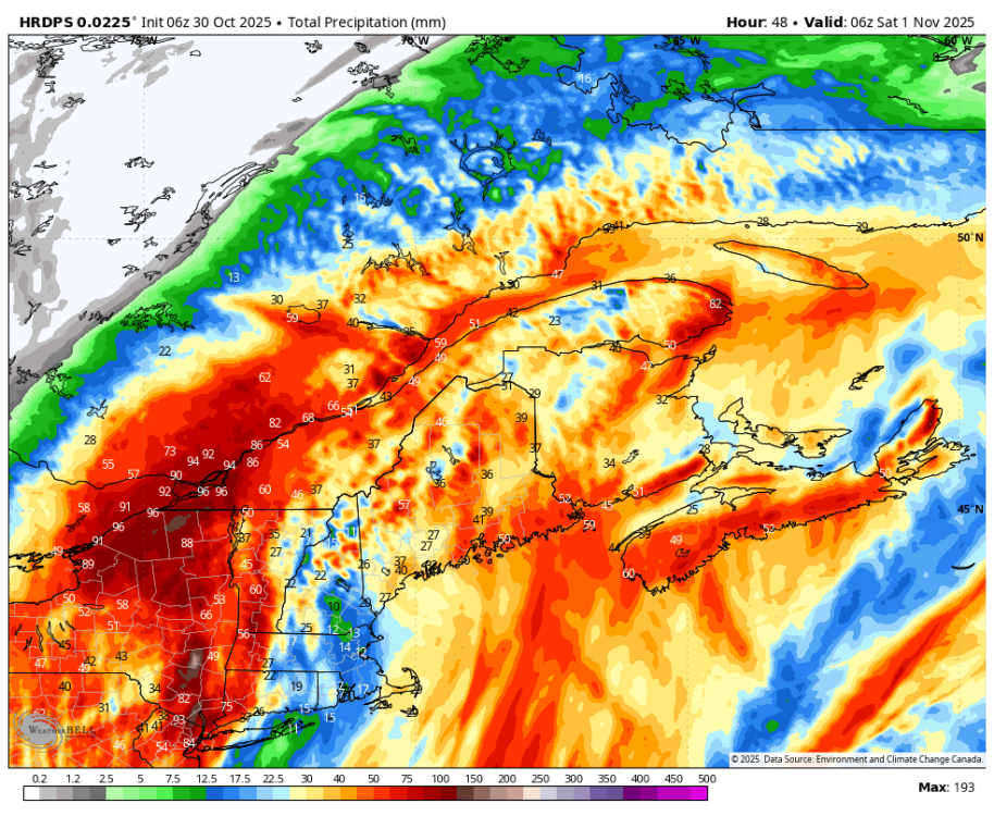 De façon général, les modèles nord-américains sont plus pessimistes pour l'Halloween que les européens qui apportent une zone avec seulement quelques averses sur la Montérégie, l'Estrie et le Centre du Québec. Mais, encore une fois... la réponse est dans la synchro entre les restes de Melissa et l'a dépression qui arrive du sud-ouest. - Hier