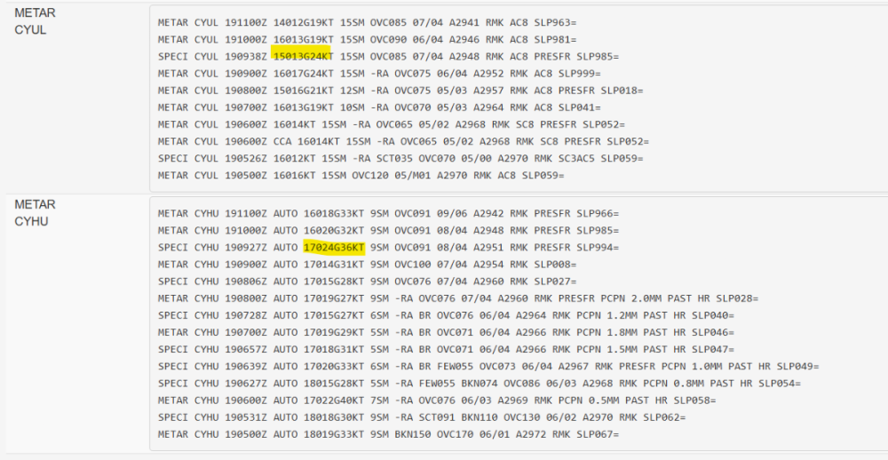 Ouin.... assez décevant pour le moment. Les vents sont passablement inférieurs à ce que les modèles prévoyaient. J'ai fouiné un peu les stations sur la rive sud et, ce que j'ai trouvé de plus fort, c'est une rafale à 36kt à CYHU. Rien pour écrire à sa mère via les stations sur Wundermap. Je suis retourné vers les modèles et, à partir de la passe d'hier soir, plusieurs modèles plantaient une dépression secondaire dans le creux sur la rive sud et le gradient s'est passablement relâché si on compare aux passes précédentes. Bon... le "meilleur" est prévu autour du front mais y'a comme une odeur de pétard mouillé pour la rive sud mde Montréal jusqu'au Centre du Québec mettons. NAM 3km passe 06Z valide à 18Z NAM passe 06Z valide à 18Z ECMWF passe de 00Z valide à 18Z METARs -