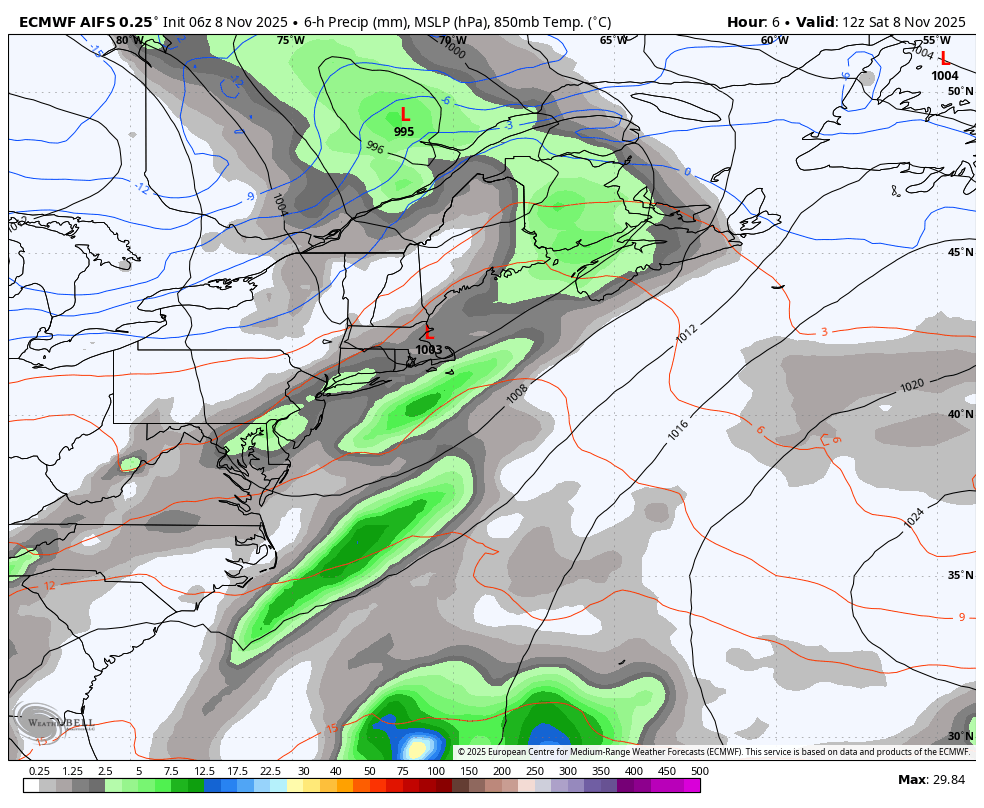 Moi c'est vraiment ce modèle que j'ai hâte de voir performé cet hiver... ECMWF AIFS - Deterministic MSLP • Precip 6 Hr (mm) • T850 08/06z- 10 réponses