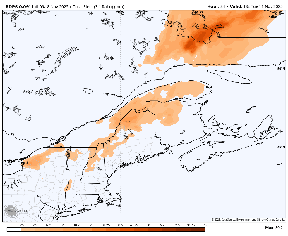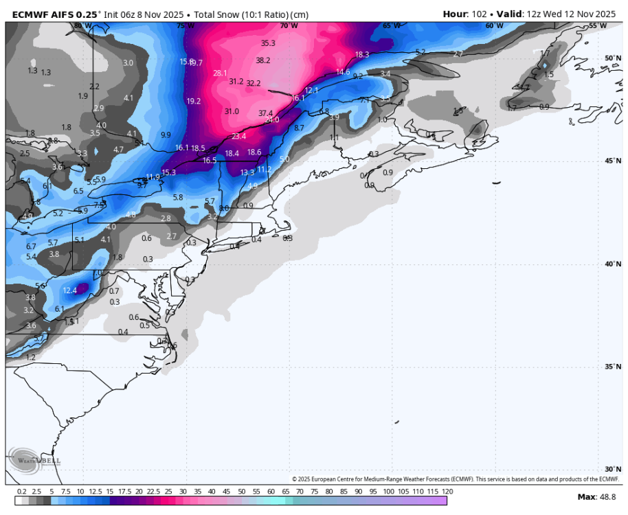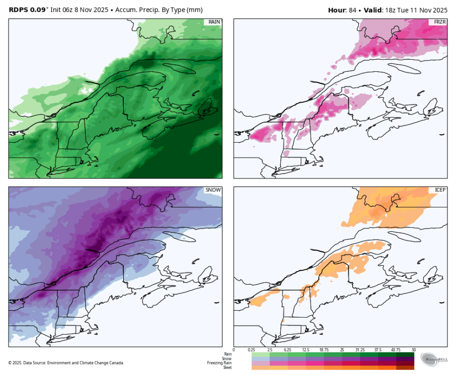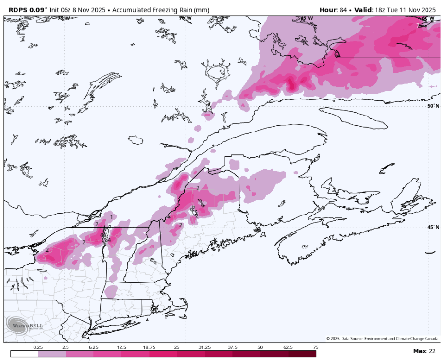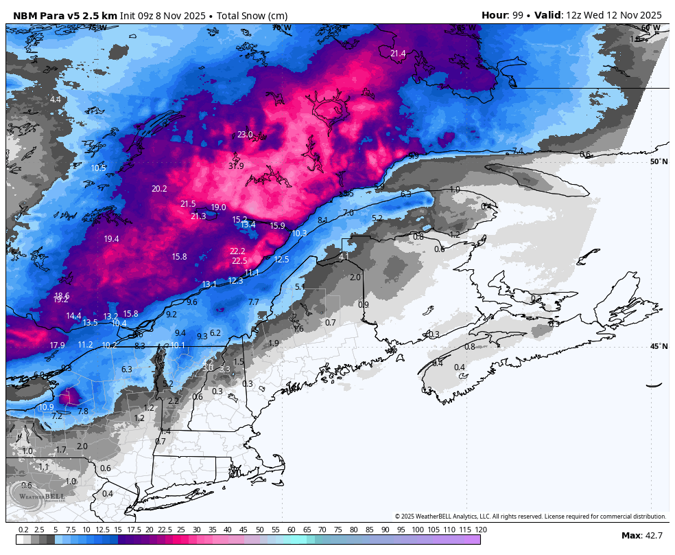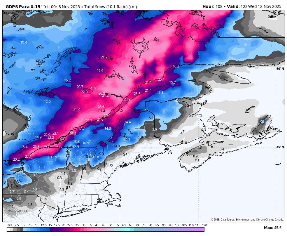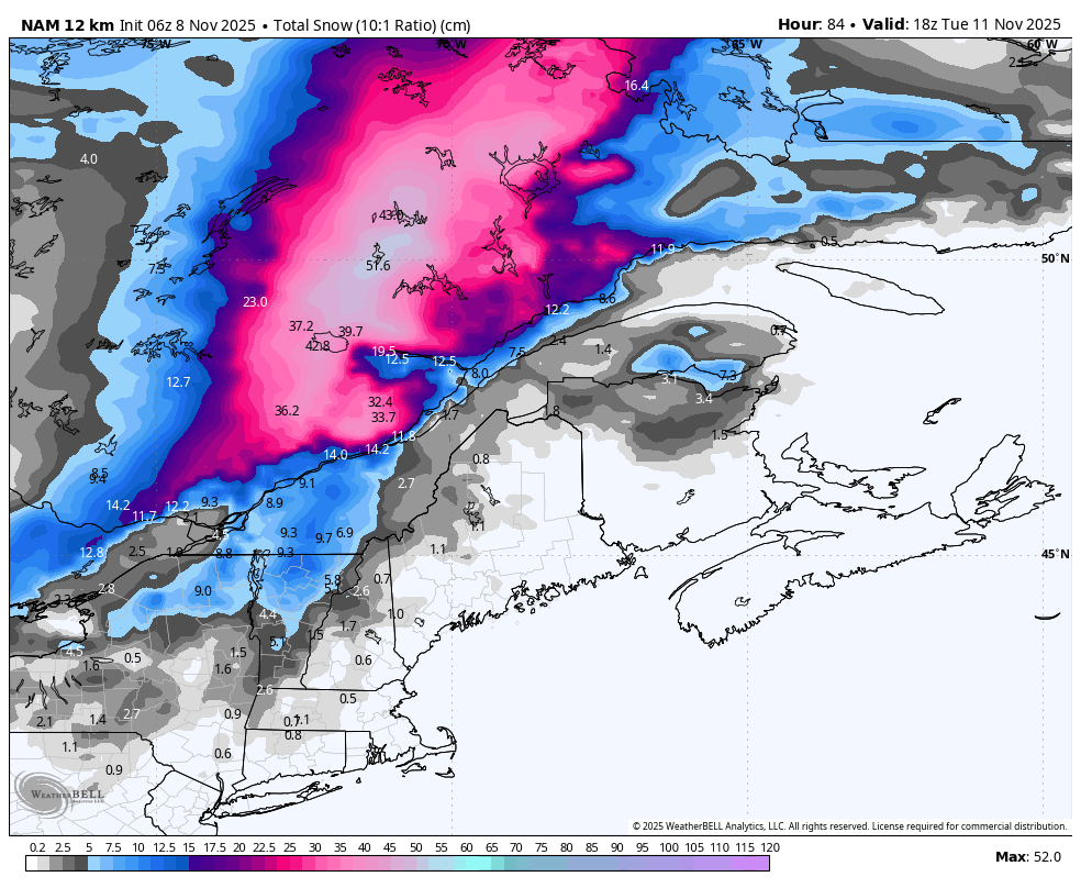 Le NAM performe souvent bien dans les cas limites entre pluie, neige, grésil, verglas... Ça commence à ressembler à 2018 ou 2019 tout ça. L'enneigement permanent, dans les Laurentides, avait débuté respectivement le 9 et le 7 novembre. Vraiment fascinant comment ça part en lion. -