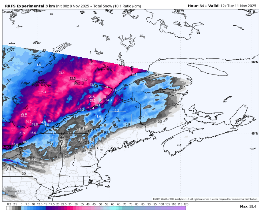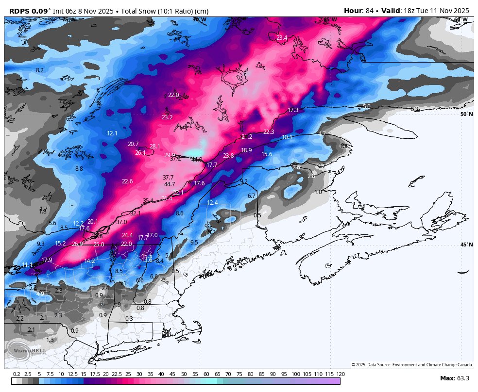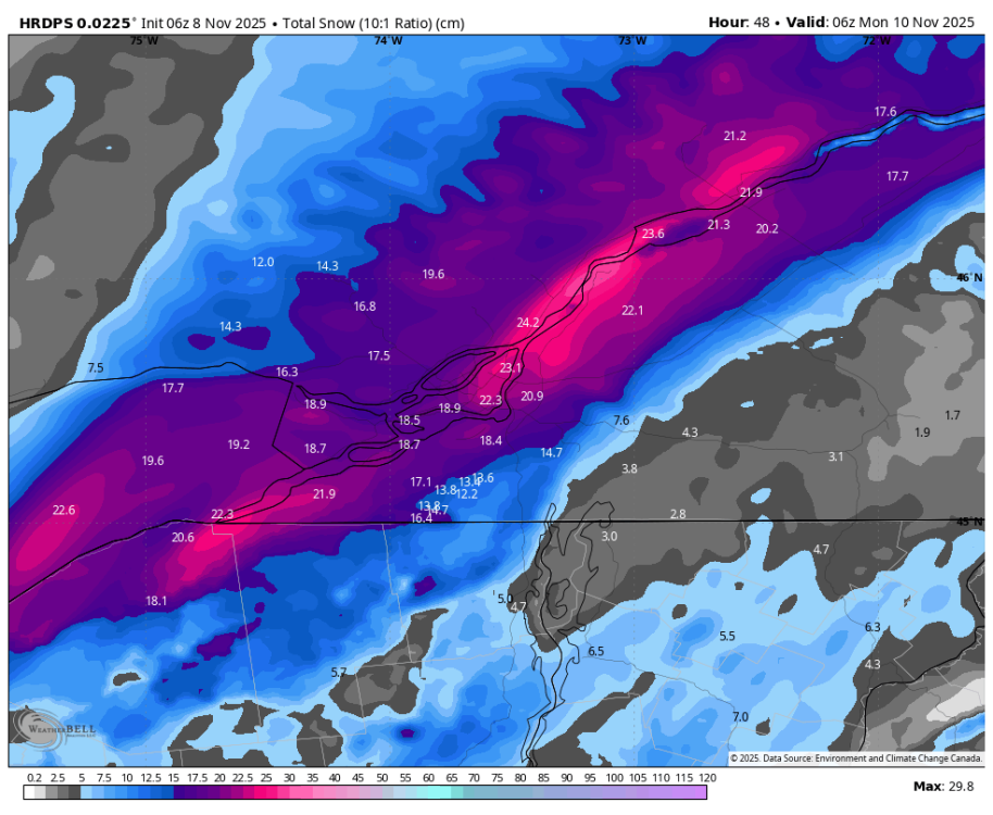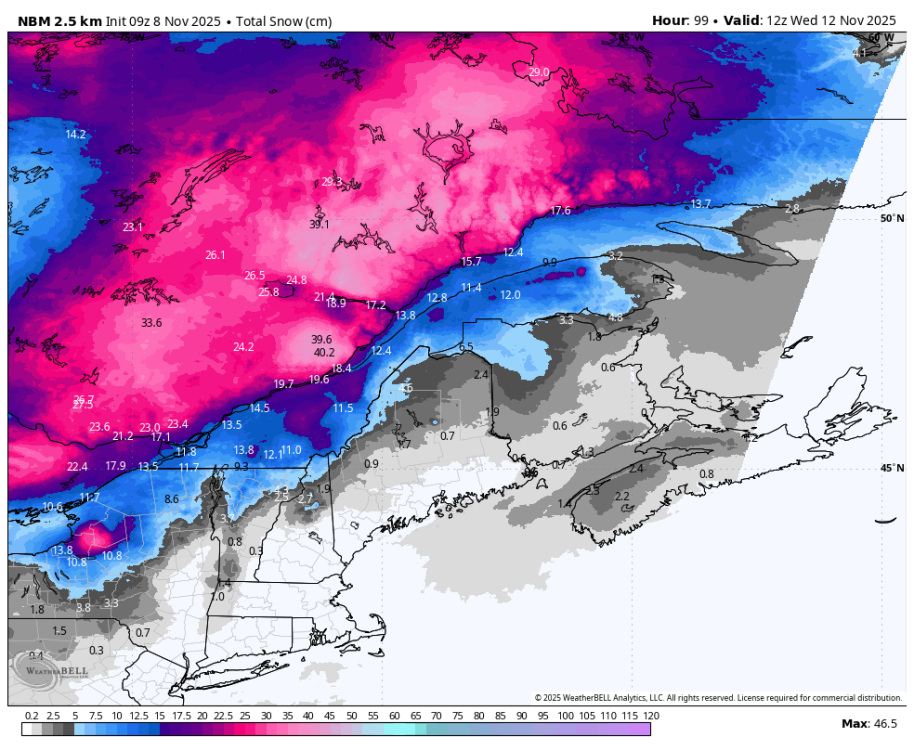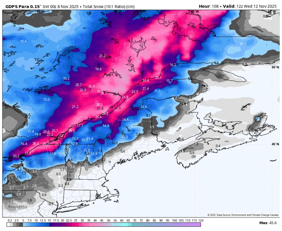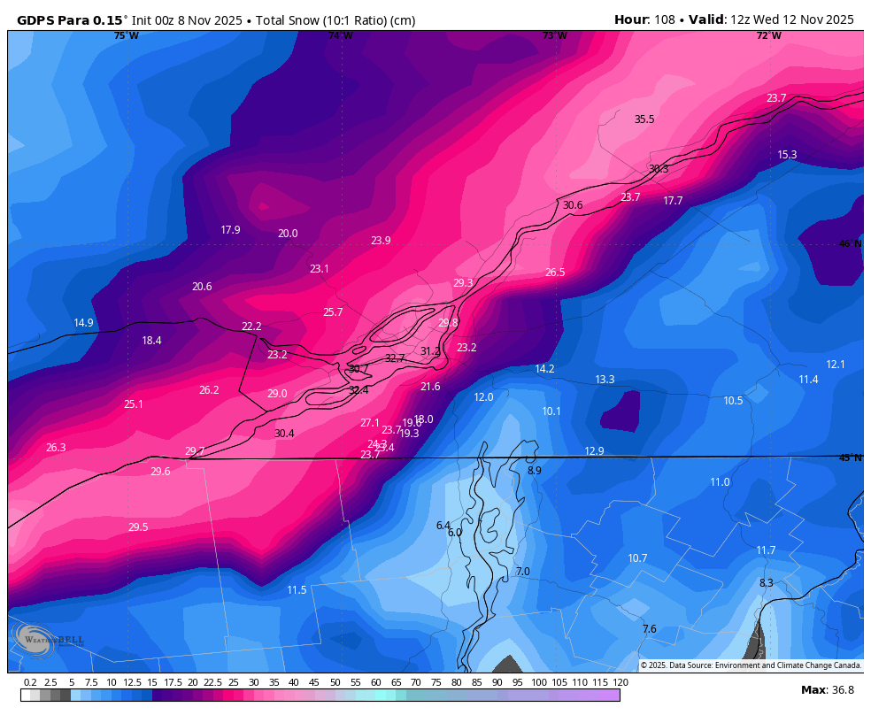 C'est vraiment le système de dimanche-lundi mardi qui est à surveiller. L'hiver débarquerait solidement au nord du fleuve dans bien des régions, à ce moment ci. -