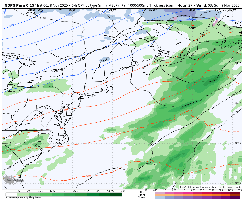 Oui ce serait le point de mire jusqu'à maintenant, l'axe Montréal ,couronne Nord et tout le Nord du Fleuve. Y'ura deux phases a cette chose et rien n'st encore bien ancrer pour tout le Sud du fleuve et l'Est de Québec. GDPS Parallel - Global 15kmMSLP • P-Type 6 Hr (mm) • Thickness 08/00z- 10 réponses