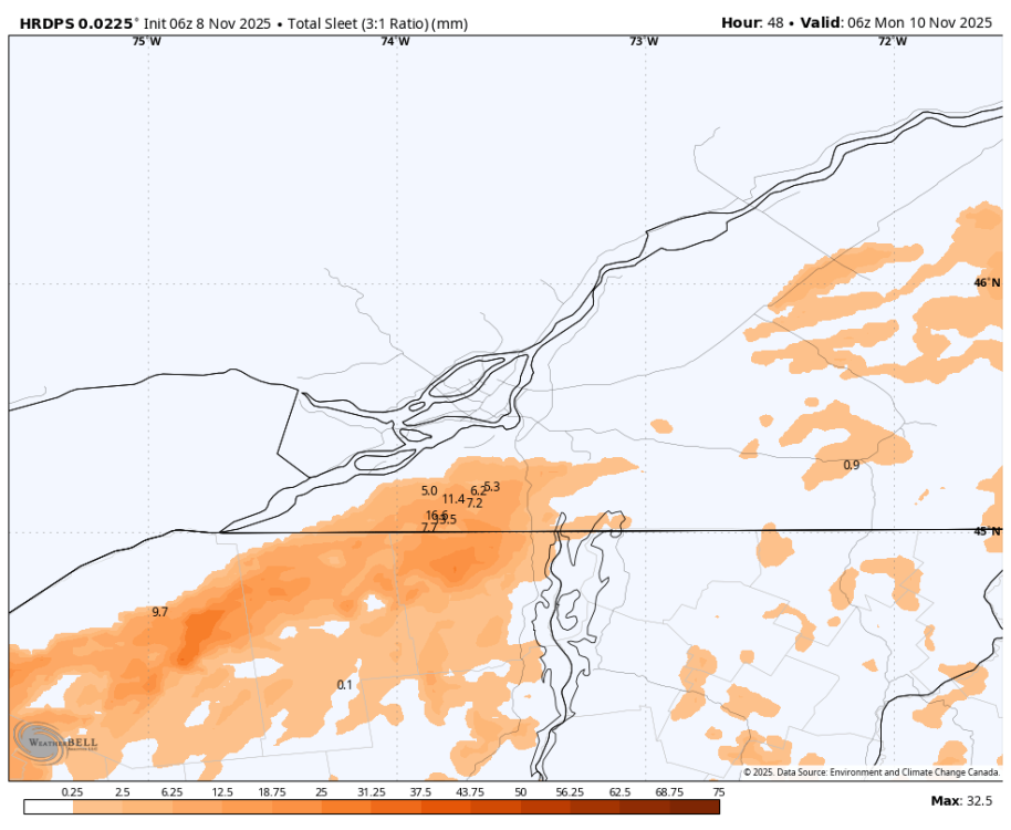 Beaucoup d'incertitude au sud du fleuve en fonction de la trajectoire encore ce midi à 60h de l'évènement et je ne vous parle même pas des températures limites le logn du fleuve et du sol encore chaud. -