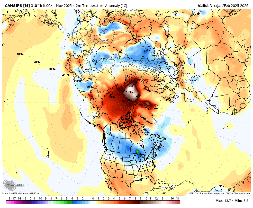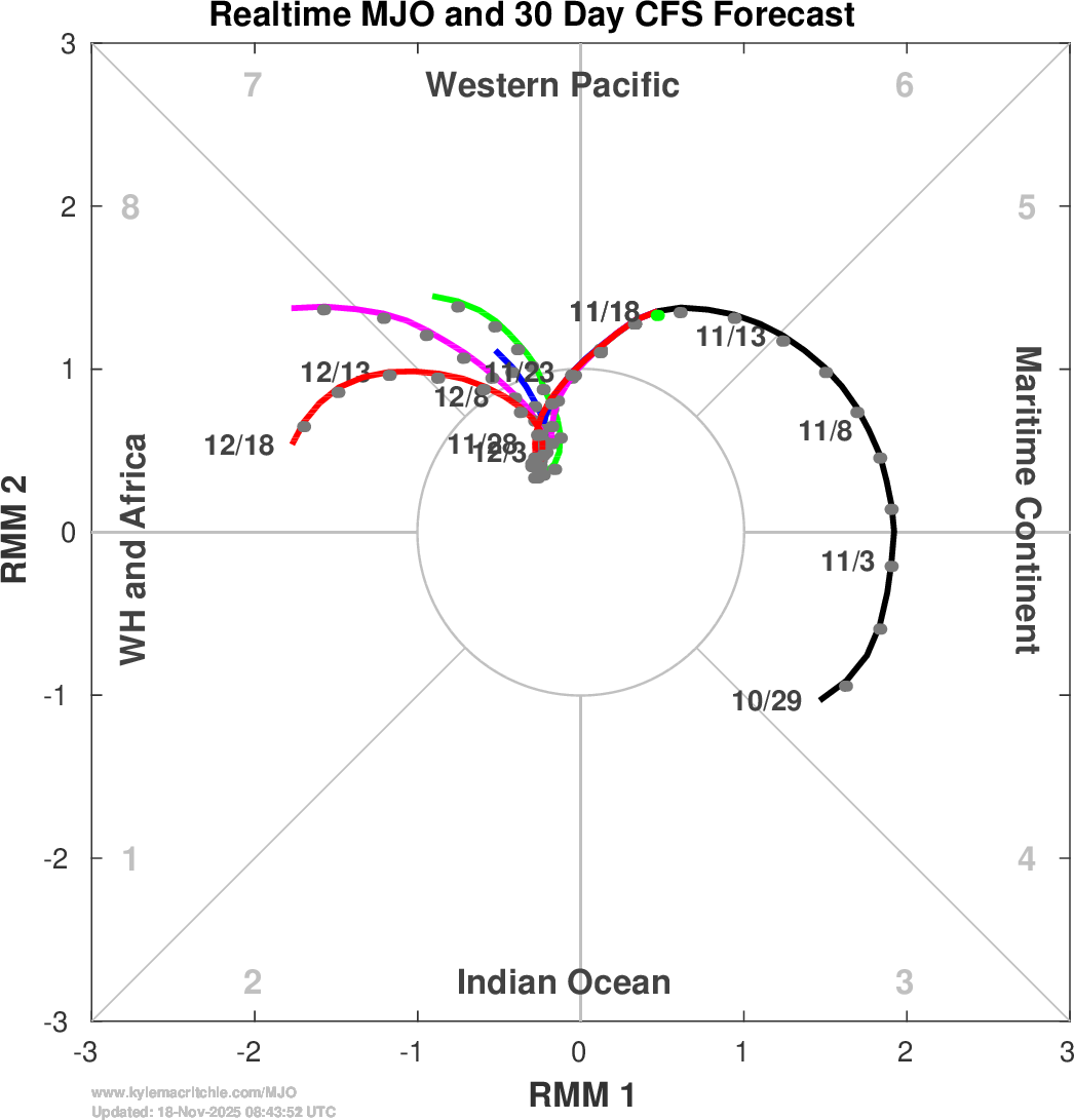 Le MJO qui entre en phase 7 puis 8 dans les prochains 30 jours. 8-1–2-3 temps plus froid pour l’Est américain, nous incluant. Si je comprends 7-8-1 promets plus de précipitations. À suivre!