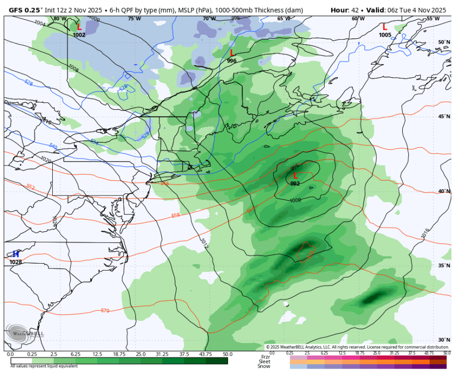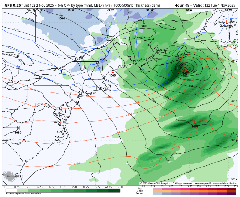 Si c'est le cas, on pourrait peut-être revoir quelque chose comme la tempête d'avant-Noel 2022 dans les Laurentides, où il était tombé près d'un mètre de neige avec cette circulation sud-est vers le nord-ouest. Ça signifierait beaucoup de neige au nord de Montréal (dans le piémont), mais passablement moins en Estrie, avec un apport de douceur plus important et une topographie défavorable...