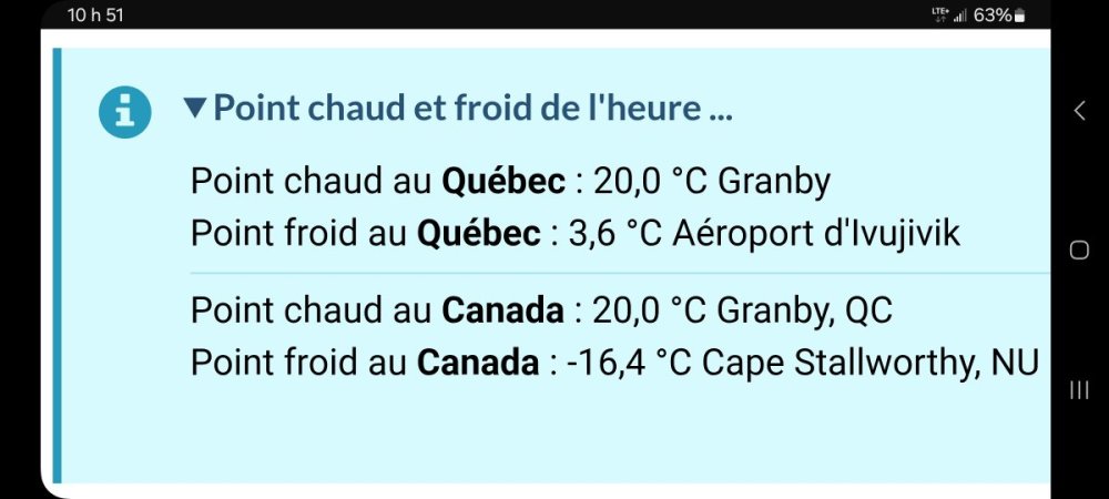 3. Et voilà. 20 degrés à Granby ce matin 10h avec de bonnes percées de soleil qui précèdent le front (qui se déplace lui à pas de tortue)