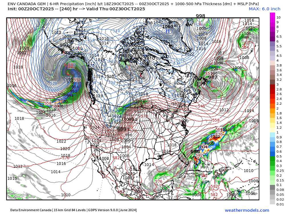 22. La fin du mois d'Octobre pourrait à nouveau être assez douce si la menace tropicale reste à l'écart. De bons systêmes semblent vouloir de former dans le Nord-Ouest du Canada amenant l'air polaire dans l'Ouest et des précipitations sur leur passage. Le problème c'est l'accélération des dépressions vers le Nord-Est, ce qui fraîne du même coup les descentes polaires sur nos latitudes et amène un assèchement de la masse d'air . Je le répète encore: Il manque une dynamique tropicale altantique qui amène souvent un changement de régime important et normal en automne dans l'Est du continent.