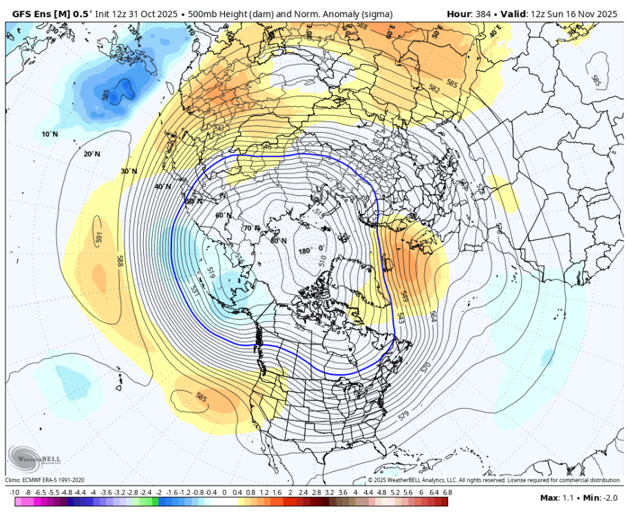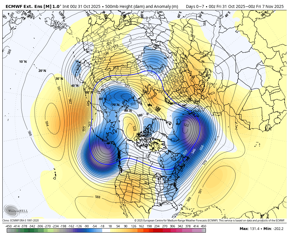 Pour faire suite... ECMWF Extended - Global 500mb Height Anomaly 7 Day (m) du 31/10 00z On pourrait ouvrir le topic hiver avec ceci facilement et si on veut voir de la neige en décembre sur nos régions...rien de mieux que cette prévisions jusqu'à la mi-décembre. On veut voir des crêtes de HP bloquer sur l'ouest et des creux sur nous. -