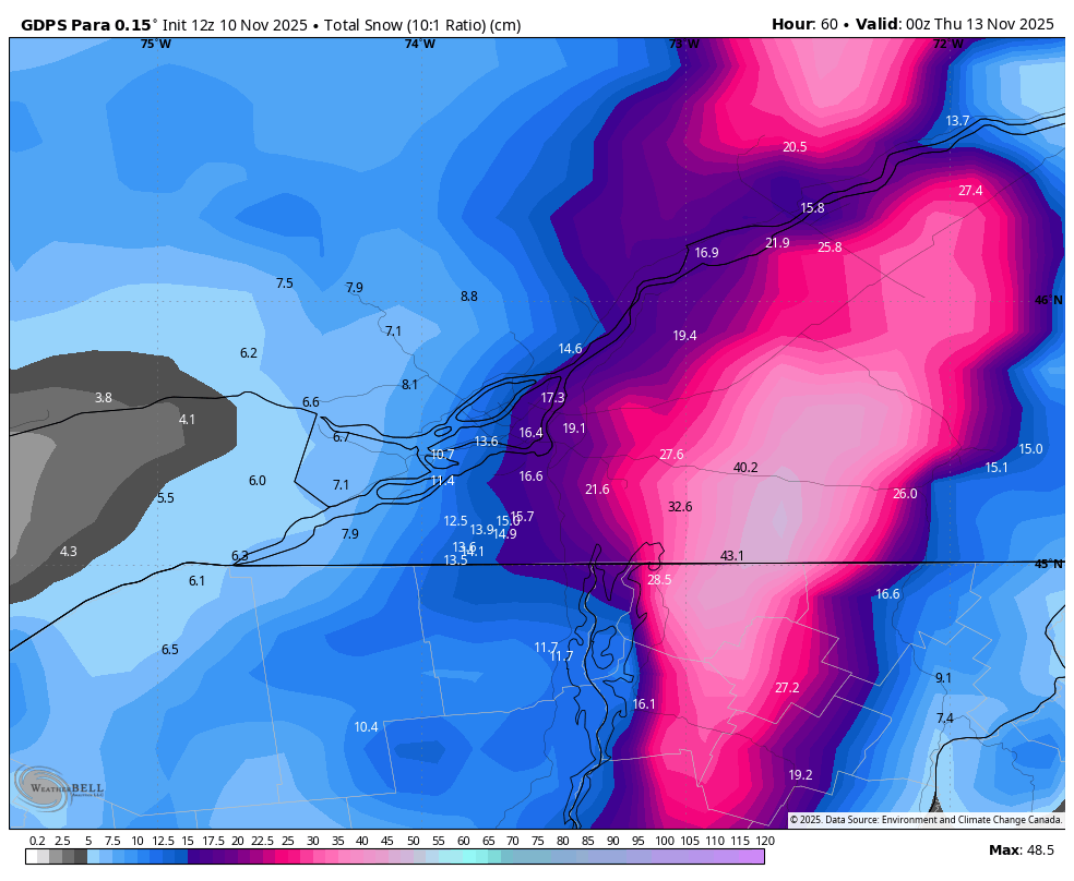HRDPS pour mon secteur et le S/O du Québec avec un centre plus @ l'Ouest... aussi par la suite, après une petite accalmie de neige, un creux venant du Nord au Sud qui va faire en sorte de ramener la neige sur ces même secteurs.- 58 réponses