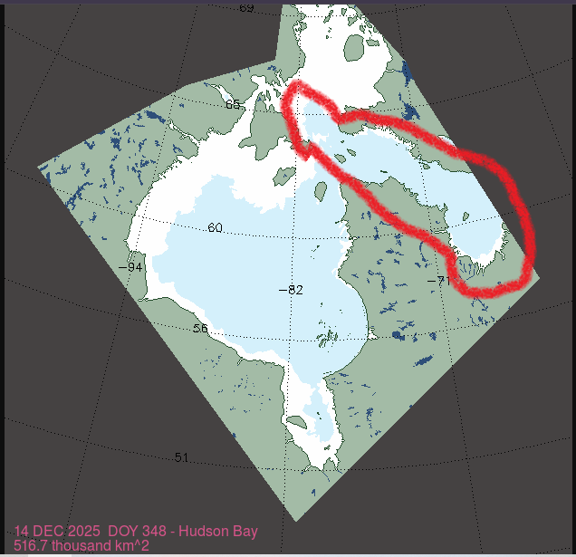 "Puis-je" me permette de dire que la baie d'Hudson accuse un sérieux retard d'englacement et que dire du courant chaud au sud est en ce mois décembre 2025 qui entre dans le Golfe du St Laurent -