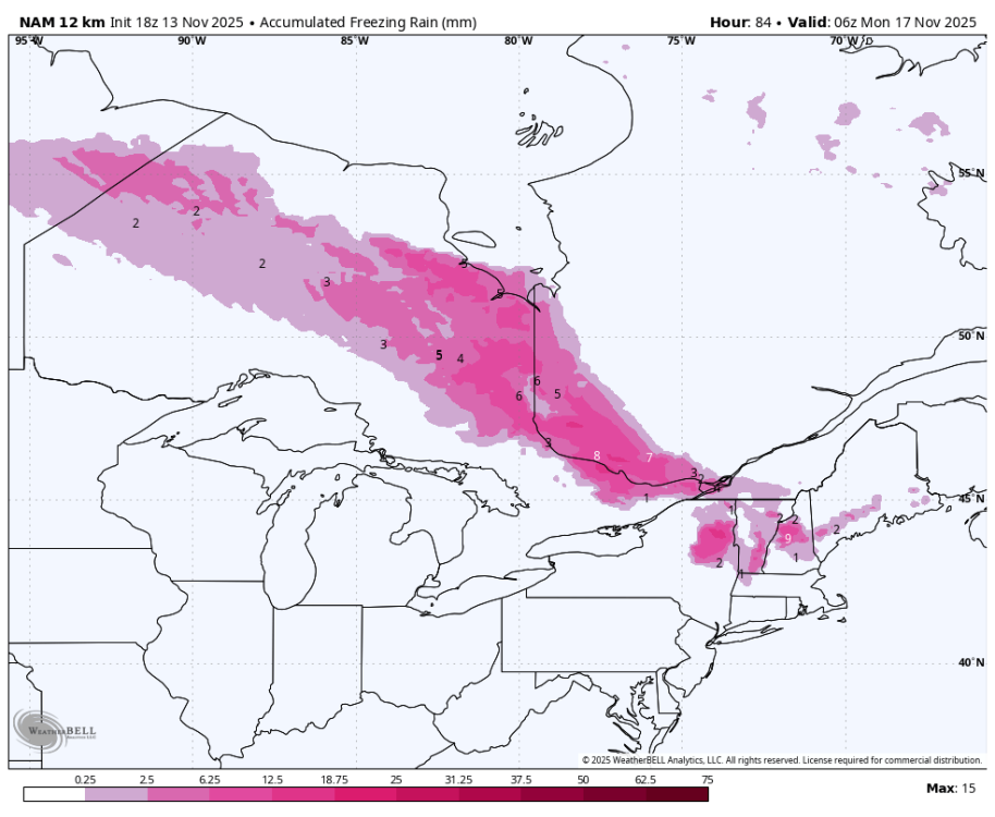 Belle dynamique ce système. On voit bien le contraste de températures. Même des éclairs et du 5 degrés jusqu'au Nord du Labrador.. -