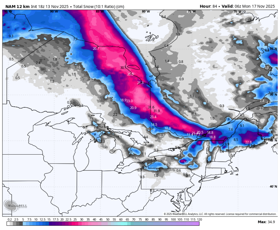 Ceux qui seront dans la bande neige d'ici la bien, ca va y aller. Par-contre j'ai hate de voir et ceci commnce a etrevisible sur le 18 z, un décalage un peu plus en Ontario de la zone plus froide. Me semble qu'il y a eu ce meme genre de systeme l'hiver passé sur le meme coin de territoire et au final le gros de la neige avait passé en Outaouais /Ottawa. Mais encore, une probable reformation sur la Cote-Est et un possible de bon systeme sur l'est du Québec. Faudra voir d'ici ce temps. Mais encore.........;-) Ce genre de mécanique météorologique ne se passe qu'avec un puissant blocage au Nord de notre tete. C'est pour cette raison que l'on voit des systemes déambuler au Nord/revenir directement au Sud /passé @ l'est et revenir vers l'ouest. C'est donc beau la météo !!!! - Aujourd’hui