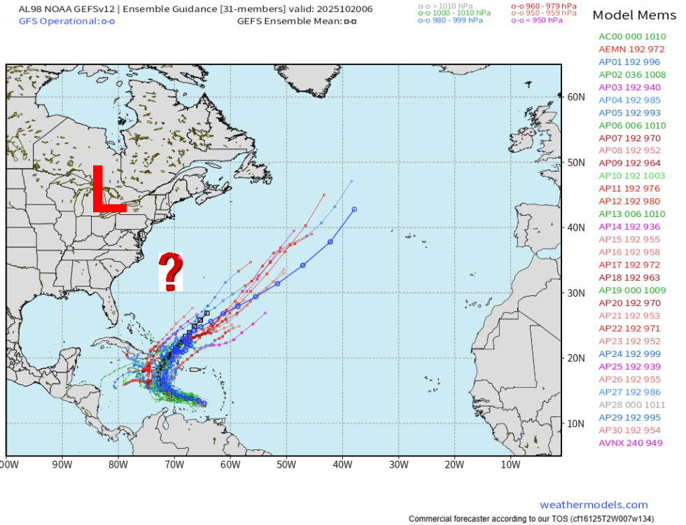 La fin du mois d'Octobre pourrait à nouveau être assez douce si la menace tropicale reste à l'écart. De bons systêmes semblent vouloir de former dans le Nord-Ouest du Canada amenant l'air polaire dans l'Ouest et des précipitations sur leur passage. Le problème c'est l'accélération des dépressions vers le Nord-Est, ce qui fraîne du même coup les descentes polaires sur nos latitudes et amène un assèchement de la masse d'air . Je le répète encore: Il manque une dynamique tropicale altantique qui amène souvent un changement de régime important et normal en automne dans l'Est du continent. -
