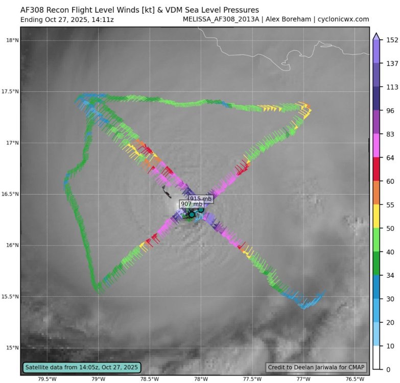 Il faut quitter l'Île tout simplement. 907 MB URNT12 KNHC 271316 VORTEX DATA MESSAGE AL132025 A. 27/12:51:50Z B. 16.30 deg N 078.09 deg W C. 700 mb 2353 m D. EXTRAP 907 mb E. NA F. CLOSED G. C10 H. 154 kt I. 249 deg 4 nm 12:48:00Z J. 320 deg 153 kt K. 249 deg 4 nm 12:48:00Z L. NA M. NA N. NA O. NA P. 7 C / 3042 m Q. 25 C / 3035 m R. 8 C / NA S. 12345 / 7 T. 0.02 / 0 nm U. AF308 2013A MELISSA OB 10 PRELIMINARY, DO NOT RETRANSMIT MAX FL WIND 158 KT 008 / 6 NM 11:35:00Z SLP EXTRAP FROM 700 MB