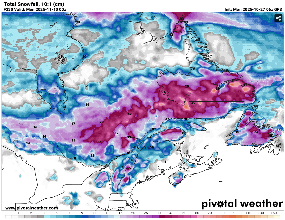 Aucune stabilité depuis plusieurs jours.. parfois un amorce de dynamique hivernale mais ça tient une passe ou deux. Faut pas être surpris, l'automne est véritablement là juste depuis la Mi-Octobre... de plus en plus tard la première neige au sol. -