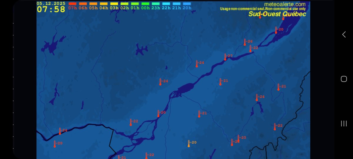 7. En effet, 1re fois cette saison que je vois autant de mauve sur cette carte (Températures à 11 am ce matin). -18 degrés comme maximum prévu ce pm à Mont-Tremblant.