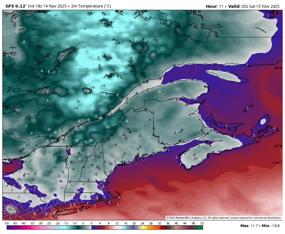 Belle dynamique ce système. On voit bien le contraste de températures. Même des éclairs et du 5 degrés jusqu'au Nord du Labrador.. -