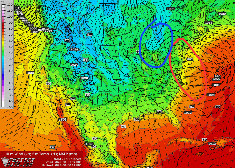 De façon général, les modèles nord-américains sont plus pessimistes pour l'Halloween que les européens qui apportent une zone avec seulement quelques averses sur la Montérégie, l'Estrie et le Centre du Québec. Mais, encore une fois... la réponse est dans la synchro entre les restes de Melissa et l'a dépression qui arrive du sud-ouest. - Hier