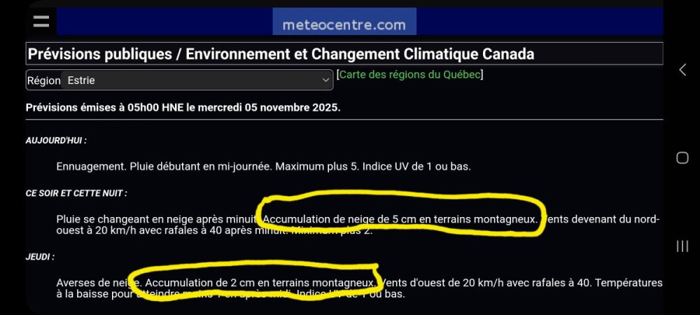 Sutton et Jay-Peak...ca va tomber solidement . Ainsi un peu partout en Estrie mais dépend vraiment de la trajectoire officielle. Demain ce sera plus facile d'avoir la bonne idée de la première neige @ bonhomme. Difficile en début novembre avec des modèles trop froid et l'inverse. -
