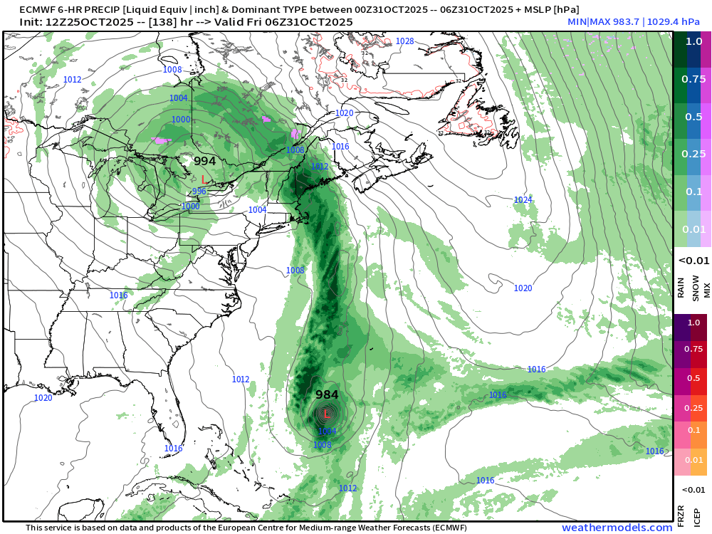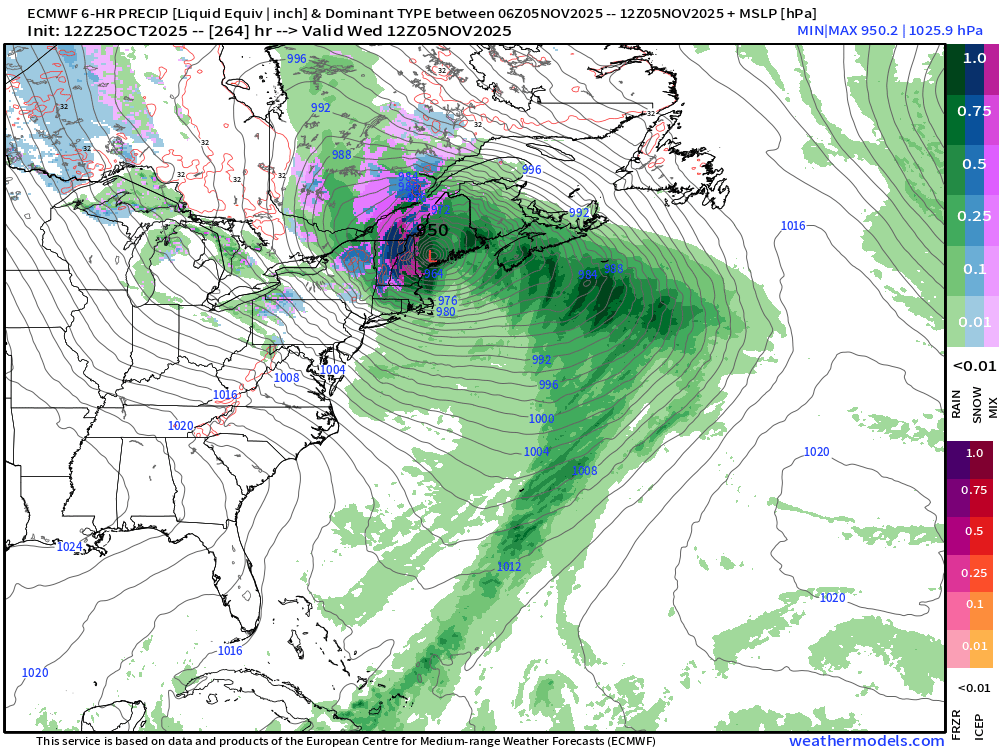 L'euro de ce midi est assez démentielle pour le 4-5-6 novembre avec un nordeaster à développement explosif et une pression de 950MB. J'y crois pas trop par contre mais toute qu'une bebitte sur le modèle. Rafale à 158 KM/h au large de Godbout. La première bordée en terrain montagneux? -