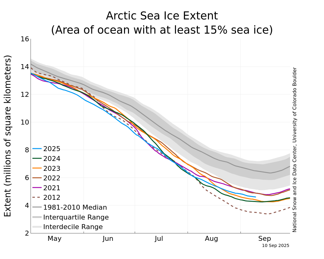 iceberg Posté(e) le 24 septembre Signaler Partager Posté(e) le 24 septembre Le minimum de glace de mer arctique de 2025 se réduit aux dix minimums les plus bas MERCREDI 17 SEPTEMBRE 2025 Le 10 septembre, la banquise arctique a probablement atteint son étendue minimale annuelle de 4,60 millions de kilomètres carrés (1,78 million de milles carrés). Le minimum de 2025 partage la dixième place la plus basse dans les archives satellitaires de près de 47 ans avec 2008 et 2010. Bien que les 19 dernières années, de 2007 à 2025, soient les 19 plus faibles étendues de glace de mer enregistrées par les satellites, il n’y a pas eu de tendance significative des étendues minimales de septembre au cours de cette période. Comme annoncé précédemment, le minimum est basé sur les données de l’Advanced Microwave Scanning Radiometer 2 (AMSR2) de l’Agence japonaise d’exploration aérospatiale (JAXA). Dans l’Antarctique, l’étendue de la glace de mer a atteint le troisième niveau le plus bas enregistré par satellite pendant la majeure partie de la saison de croissance, mais le maximum n’a pas encore été atteint. Les grandes fluctuations de l’étendue sont typiques de la glace de mer de l’Antarctique près du maximum saisonnier, ce qui entraîne souvent un certain retard dans l’identification du maximum, qui se produit généralement à la fin de septembre ou au début d’octobre, mais a été atteint dès le 30 août. Veuillez noter qu’il s’agit d’une annonce préliminaire. Les vents changeants ou la fonte tardive de la saison pourraient encore réduire l’étendue de la glace arctique, comme cela s’est produit en 2005 et 2010. Les scientifiques du NSIDC publieront une analyse complète de la saison de fonte de l’Arctique et discuteront de la croissance de la glace de mer en hiver en Antarctique au début du mois d’octobre. Aperçu des conditions Le 10 septembre, la banquise de l’Arctique aurait probablement atteint son étendue minimale annuelle de 4,60 millions de kilomètres carrés (1,78 million de milles carrés) (figure 1a). Lorsque le soleil plonge sous l’horizon de l’Arctique, la baisse des températures de l’air favorise l’expansion de l’étendue de la glace tout au long de la saison de croissance. Cependant, avec d’importantes plaques de faible concentration de glace restantes, une tempête de fin de saison pourrait comprimer la glace de mer et pousser l’étendue de la glace encore plus bas. Si le 10 septembre est la date minimale, l’étendue minimale de 2025 a été atteinte quatre jours plus tôt que la date minimale médiane du 14 septembre de 1981 à 2010. L’intervalle interquartile des dates minimales est du 11 au 19 septembre. Graphique 1a. L’étendue de la banquise arctique le 10 septembre 2025 était de 4,60 millions de kilomètres carrés (1,78 million de miles carrés). La ligne orange montre l’étendue moyenne de 1981 à 2010 pour ce jour-là. Données de l’indice de glace de mer. À propos des données — Source : National Snow and Ice Data Center Graphique 1b. Le graphique ci-dessus montre l’étendue de la glace de mer arctique au 10 septembre 2025, ainsi que les données quotidiennes sur l’étendue de la glace pour les quatre années précédentes et l’année la plus basse record. 2025 est illustré en bleu, 2024 en vert, 2023 en orange, 2022 en marron, 2021 en magenta et 2012 en marron pointillé. La médiane de 1981 à 2010 est en gris foncé. Les zones grises autour de la ligne médiane montrent les intervalles interquartile et interdécile des données. Données de l’indice de glace de mer. — Crédit : Centre national de données sur la neige et la glace Conditions en contexte L’étendue minimale de cette année, basée sur une moyenne sur 5 jours, semble avoir été fixée au 10 septembre. C’est 1,21 million de kilomètres carrés (467 000 miles carrés) au-dessus de l’étendue minimale record de l’ère satellite de 3,39 millions de kilomètres carrés (1,31 million de miles carrés), qui s’est produite le 17 septembre 2012 (Figure 1b). C’est également 1,62 million de kilomètres carrés (625 000 miles carrés) en dessous de l’étendue minimale moyenne de 1981 à 2010, ce qui équivaut à environ la perte de taille de l’Alaska. Dans les enregistrements satellitaires de 47 ans, les 19 minimums les plus bas ont tous eu lieu au cours des 19 dernières années. La tendance globale à la baisse de l’étendue minimale de 1979 à 2025 est de 12,1 % par décennie par rapport à la moyenne de 1981 à 2010. D’après la tendance linéaire, la perte de glace de mer est d’environ 74 000 kilomètres carrés (29 000 milles carrés) par an, ce qui équivaut à la perte annuelle de l’État du Dakota du Sud ou de l’Autriche. Cette tendance générale doit être considérée avec la mise en garde qu’il n’y a pas eu de tendance significative à la baisse des minimums de septembre au cours des deux dernières décennies. Les causes de cette tendance à l’aplatissement font l’objet d’un débat animé au sein de la communauté scientifique de l’Arctique. Cependant, toutes les années après 2006, de 2007 à 2025, ont toujours eu une étendue minimale inférieure à celle de toutes les années précédentes dans le registre de 1979 à 2006. Tableau 1. Les 10 plus faibles étendues minimales de glace de mer de l’Arctique (données satellites, 1979 à aujourd’hui) RANG ANNÉE ÉTENDUE MINIMALE DE LA GLACE DATE EN MILLIONS DE KILOMÈTRES CARRÉS EN MILLIONS DE KILOMÈTRES CARRÉS 1 2012 3.39 1.31 Sept. 17 2 2020 3.82 1.47 Sept. 16 3 2007 2016 2019 4,16 4,17 4,19 1,61 1,61 1,62 18 septembre 10 10 septembre 18 6 2024* 2023* 4,25 4,26 1,64 1,64 13 septembre 19 septembre 8 2011 4.34 1.68 Sept. 11 9 2015 4.43 1.71 Sept. 9 10 2008 2025 2010 4,59 4,60 4,62 1,77 1,78 1,78 19 sept. 10 sept. 21 sept. Les valeurs dans un rayon de 40 000 kilomètres carrés (15 000 miles carrés) son