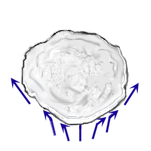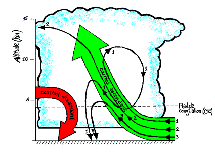 Le grêlon peut aussi suivre une trajectoire comme celle-ci. Il peut monter et descendre dans le cumulonimbus à plusieurs reprises. Finalement, lorsque le grêlon est trop lourd et que les courants ascendants n'arrivent plus le transporter vers le haut, il tombe. En tombant, la glace fond, car l'air est plus chaud vers le bas. Si elle ne fond pas complètement, on se retrouve avec des précipitations de grêle au sol. |