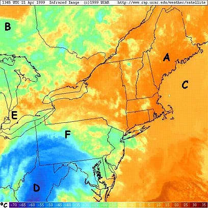 ![]() Le capteur infrarouge du satellite peut recevoir le signal autant le jour que la nuit, car ce rayonnement est indépendant de la lumière. Pour vérifier votre compréhension des photos satellites infrarouges, placez en ordre croissant de température (du plus froid au plus chaud) les 6 points (identifiés par des lettres) de la photo suivante.